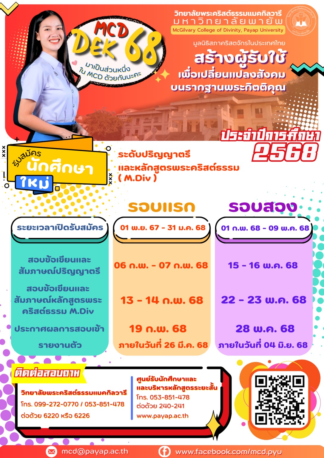 - รับสมัครออนไลน์ผ่านระบบรับสมัคร PYU e-admission ตั้งแต่วันที่ 1 พ.ย.-26 ธ.ค.68