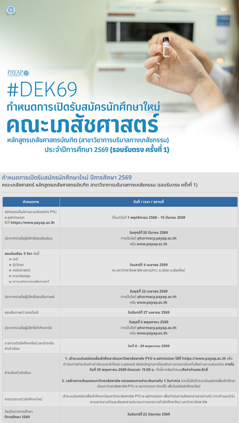 - ติดตามประกาศกำหนดการและรายชื่อผู้มีสิทธิ์สอบทางเว็บไซต์ pharmacy.payap.ac.th หรือ www.payap.ac.th