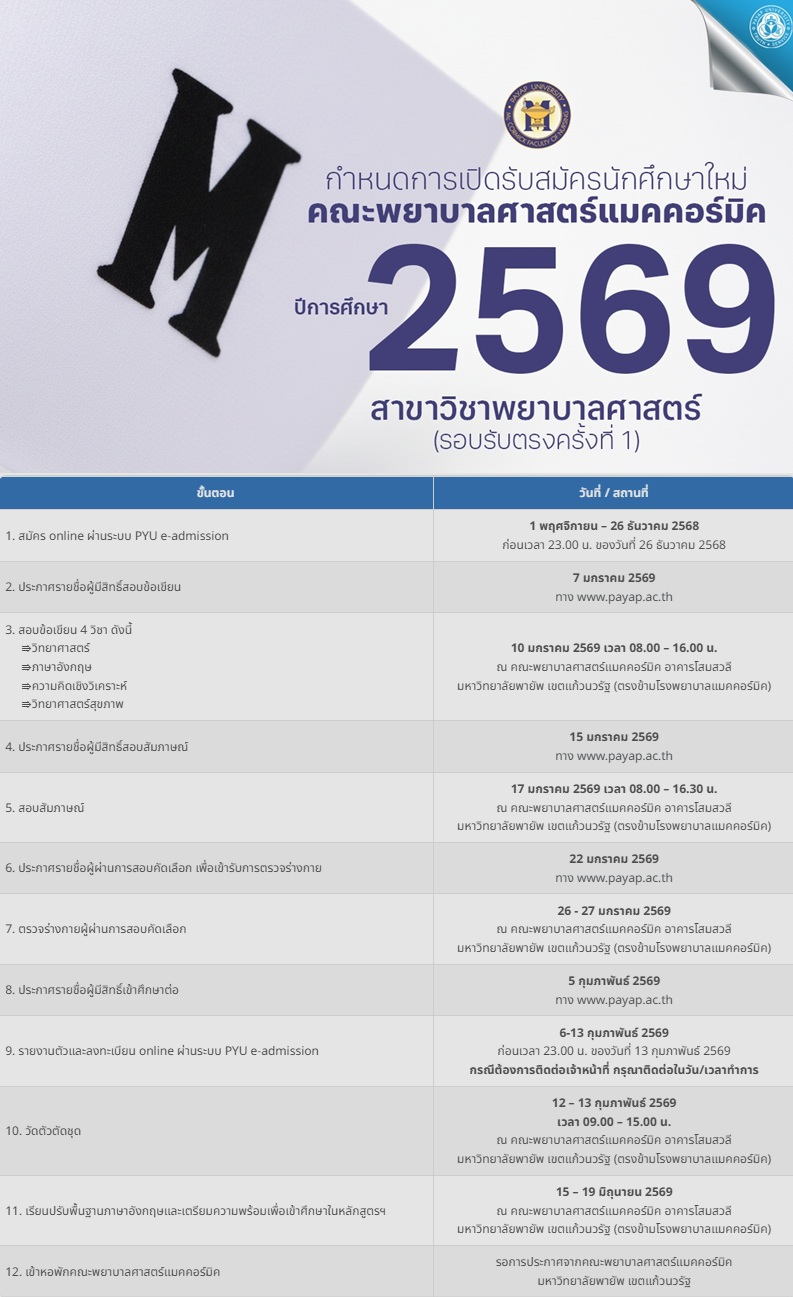 - รับสมัครออนไลน์ผ่านระบบรับสมัคร PYU e-admission ตั้งแต่วันที่ 1 พ.ย.68-15 มี.ค.69